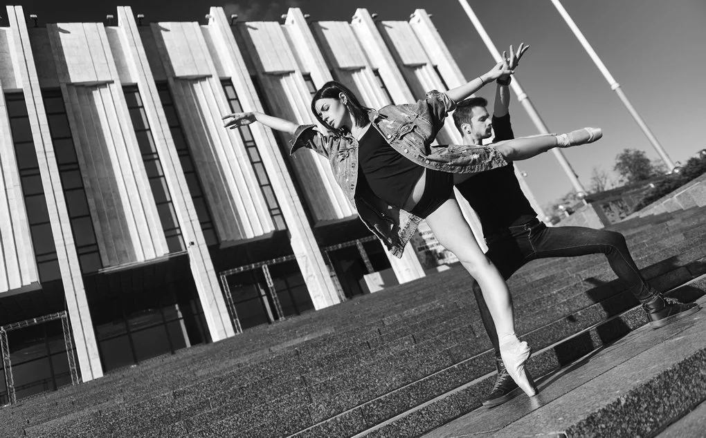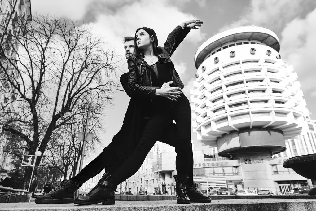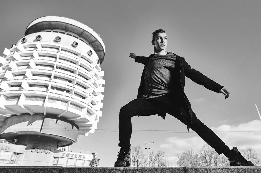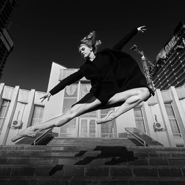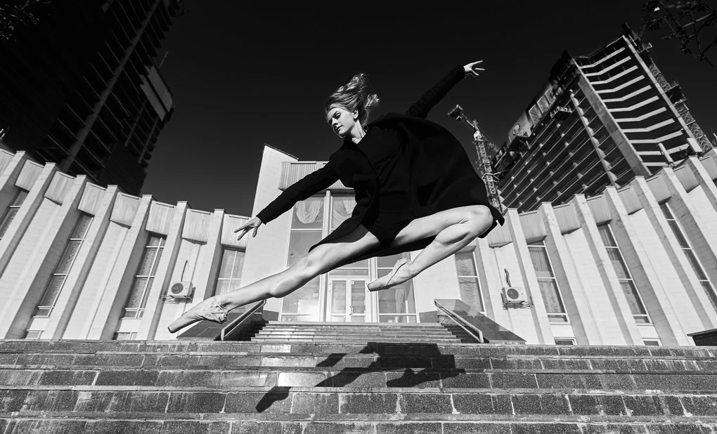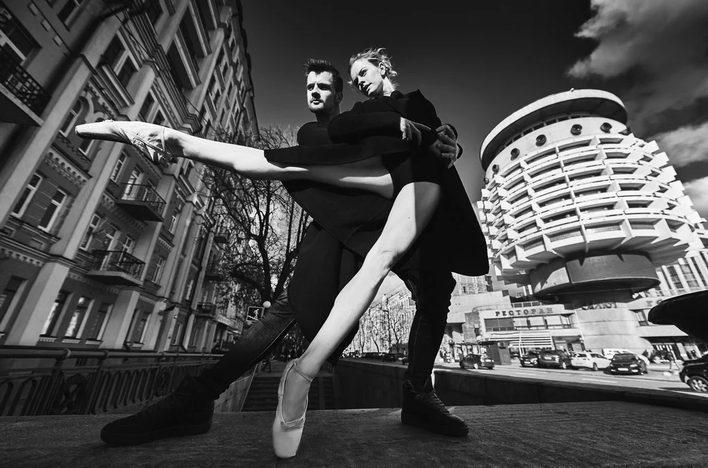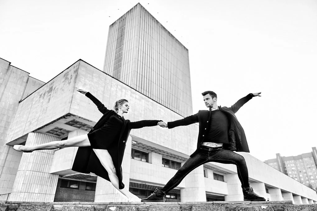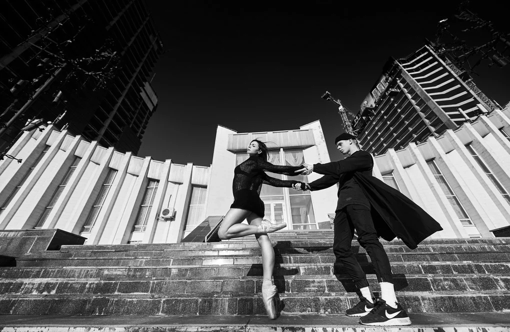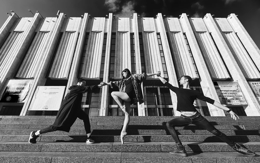 This photo project transfers the performance from the stage to the urban landscape of Kyiv. The dancers pose and move among architectural landmarks in the Brutalist style, where monumental concrete structures contrast with the living plasticity of human bodies. It is not merely a play of form and light — it is a metaphor for human emotion woven into the rhythm of the modern city.