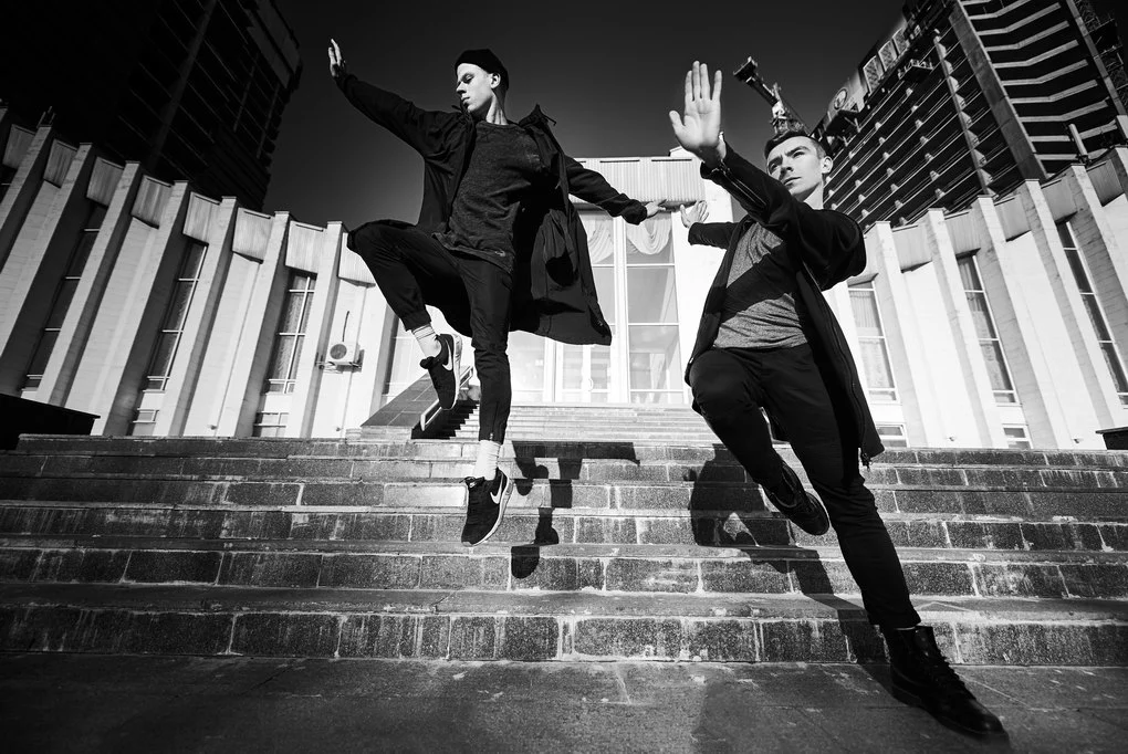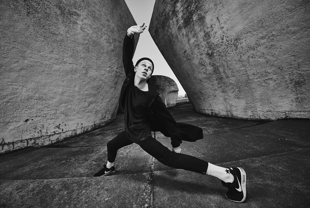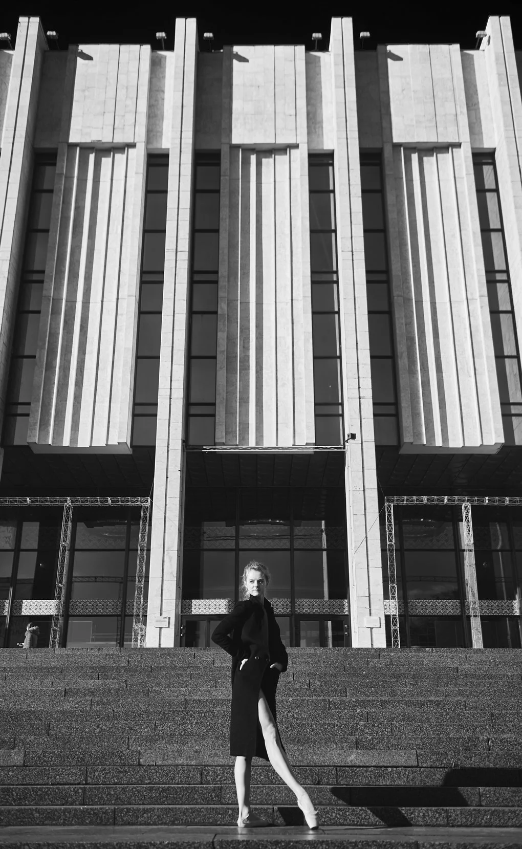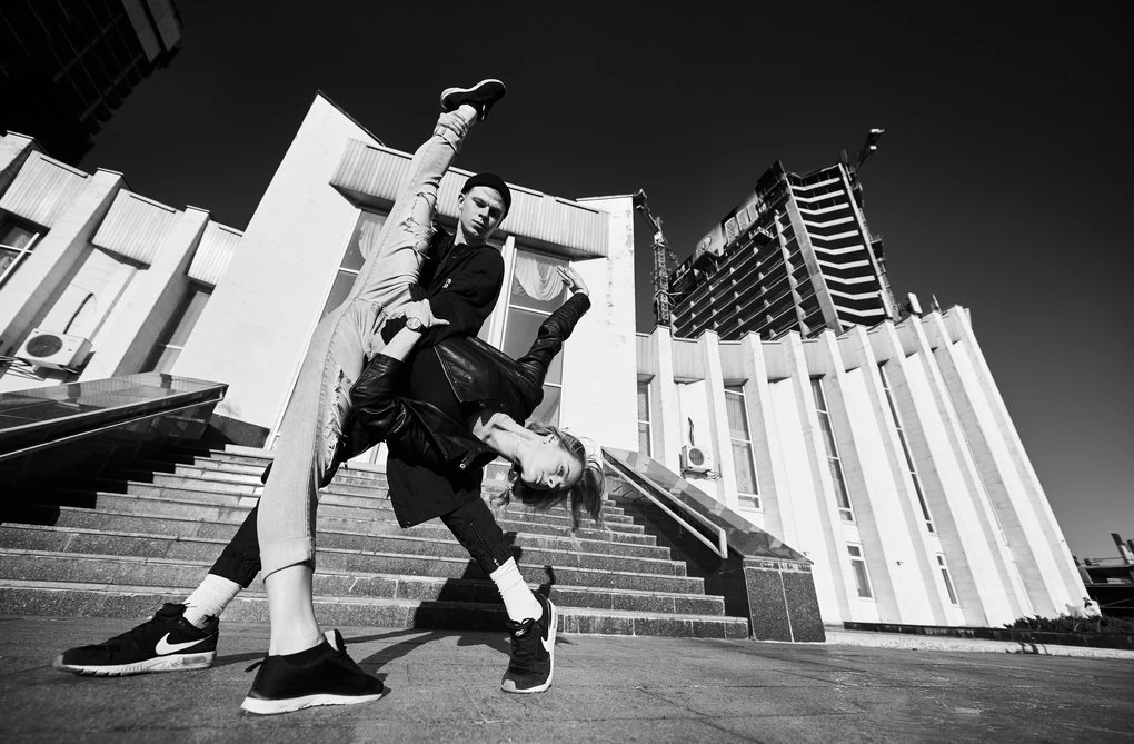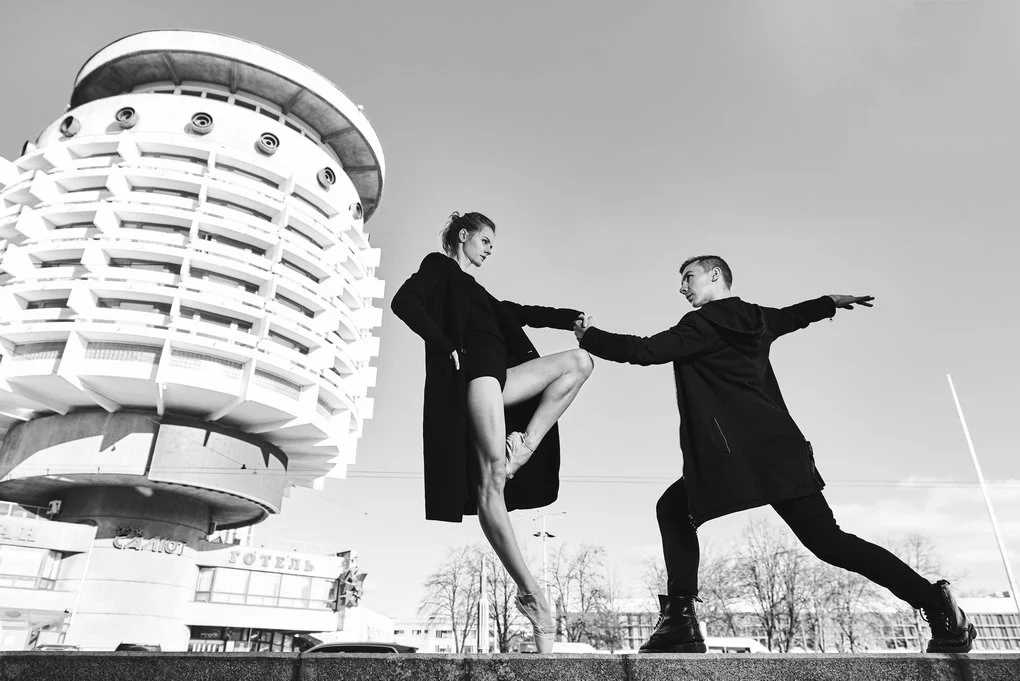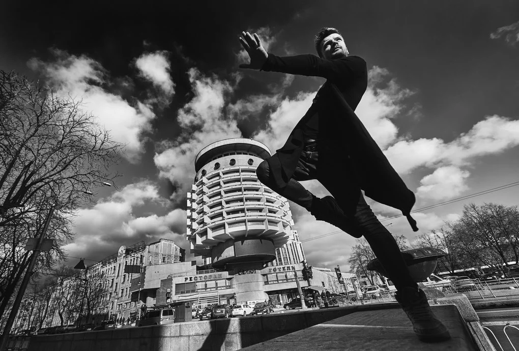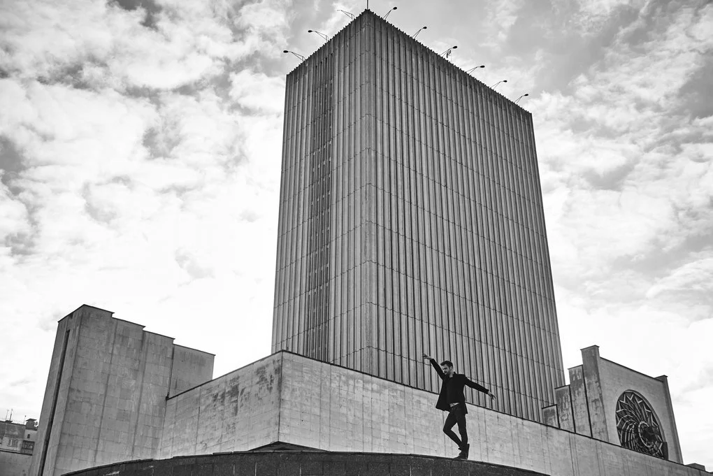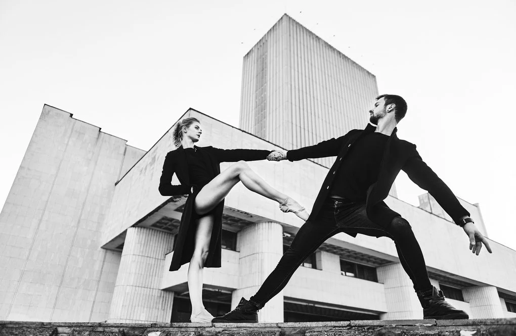 This photo project transfers the performance from the stage to the urban landscape of Kyiv. The dancers pose and move among architectural landmarks in the Brutalist style, where monumental concrete structures contrast with the living plasticity of human bodies. It is not merely a play of form and light — it is a metaphor for human emotion woven into the rhythm of the modern city.