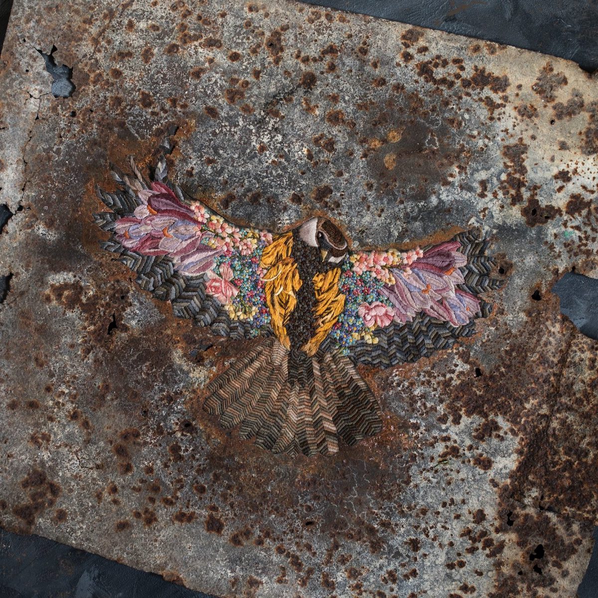 Так обстоят дела с творчеством Дианы Евтух — украинской художницы из г. Львов. Ее работы становятся все более популярными в Сети Интернет. Диана размещает вышитые образы цветов и птиц среди металла и дерева. Эти образы художница использует для того, чтобы продемонстрировать зрителям контрастность своих переживаний.